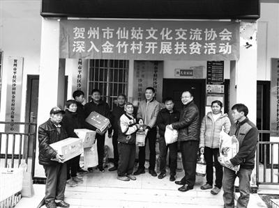11月20日,贺州市仙姑文化交流协会一行3人在副会长、秘书长苏先伟的带领下深入贺州市平桂区沙田镇金竹村慰问邓妹四等10多户瑶族(土瑶)贫困户,给他们送去大米、食油、面条等价值5000多元的慰问品,还以购买土特产的方式开展扶贫,当天3人共购买了3000多元的瑶家土特产。(贺州市民宗委 黎学良)