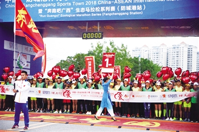 上午7时30分,在美景如画的北部湾海洋文化公园,随着“砰、砰、砰”的发令枪响起,跑友们像大海潮水般奔腾着涌向长长的跑道。2018中国-东盟国际马拉松由中央电视台、中国田径协会、中国-东盟博览会秘书处、广西东盟国际博览事务局、广西体育局和防城港市人民政府共同主办。