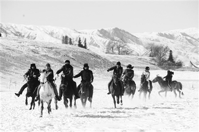 11月17日,当地居民在雪地上进行赛马比赛。当日,新疆那拉提冰雪旅游文化节在新疆新源县那拉提旅游风景区开幕。此次冰雪节举办了滑雪运动会、雪地越野跑、雪地足球、雪地摔跤等活动,为游客带来冰雪之乐。(新华网11.20)