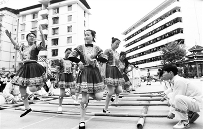 图为学生们在三江中学操场上比赛跳竹竿舞。