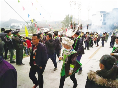 苗家姑娘头上的银饰不时闪亮,身上深黑色的衣服也隐隐发光。伴随着芦笙乐声,她们情不自禁地唱起山歌,扭动着身子,跳起舞来。吹芦笙的人群中也有七八岁的小朋友,他们从小耳濡目染,很快就学会了吹奏这种独具特色的民族乐器,不会吹吹打打,哪里算得上真正的苗家人呢!