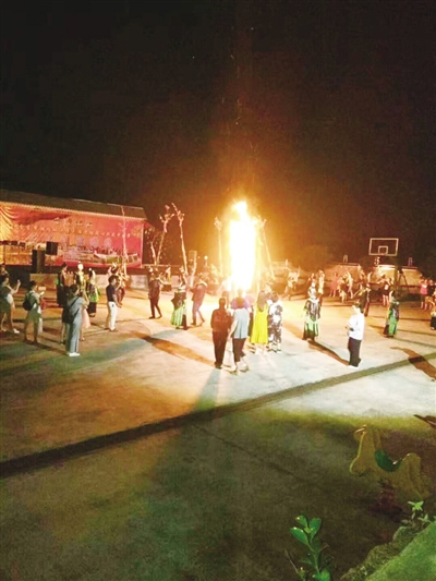 黑夜继续点燃人们的激情。歌舞表演结束,篝火晚会正在如火如荼地进行,柴火燃起来,照亮人们红扑扑的脸庞,照亮了一切。灯光暗了下去,也许它觉得有些多余。意犹未尽的人们手牵手舞起来,让篝火点燃人们的激情。不知谁唱起了壮族的山歌,嘹亮的歌声穿过黑暗,飘在空中。人们舞得更加起劲了,脚踩得地板“踢踏”响。口里那种富有节奏感的“伊呀哟”声音不断地喊起来。气氛达到了高潮,没有人愿意停下来,都尽情地跟夜色舞在一起。