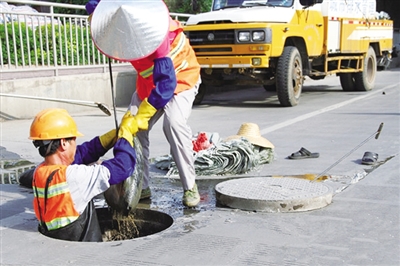 每当这个时候,下井作业的艰巨任务就落到了邓深海的肩上。冒雨对路面积水进行抽排,持续几个小时泡在积水中,引导行人避开井口区,是清淤队的队员们几乎每年都要做的工作。