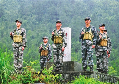 春,乍暖还寒时候,浓雾更兼细雨,路石湿滑,羊肠小道两旁的灌木丛,会将雾中的雨雨中的雾往脸上往眼睛往军用雨衣里挤,满脸满眼的水,鞋里也是水,甚至身里也是水。但,巡逻的脚步没有停憩……夏,躬腰穿过藤蔓,涉水踏过沟涧,蛇从脚旁循迹,山蚂蟥却吸在手上、脖子上、额头上、耳根处享用哨兵的鲜血。甚至头顶上还有狂风暴雨还有龙蛇走电,耳边除了风声雨声雷鸣声,还有山洪的轰隆还有泥石流的嘶叫,但巡逻的身影依然若隐若现地前行。秋,烈日当空,悬崖边、峭壁上,风吹草低,攀上去,爬下来,手脚并用,汗流浃背,口干舌燥,但每一座界碑旁的每一张脸每一双眼睛,都是满满的欣慰、满满的爱、满满的坚强。冬,天寒地冻,遮天蔽日的乔木下,落叶与枯枝覆盖路面,踩下去,或是一个坑,或是一洼泉水,还有青苔布满的石头,踏上去,看似干硬的表皮却包裹着湿滑。摔倒、绊倒,甚至仰面朝天跌倒,哨兵们都重新站起来,抹抹伤口,擦掉血迹,整理装备,互相搀扶,始终没有掉队……这些特写镜头,不是电影,不是电视,而是现实中,陆兰军哨长和他的哨兵,一年四季巡逻路上的真实写照。每周1一次,每月4次,每年48次往返的真实写照。