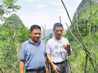 一花引来百花香,古周村的成功,起到了示范作用。下南乡的下塘村、上南乡的民权村以及全县石漠化严重的村都学习、推广、实施“古周村模式”,脚踏实地开展综合治理石漠山,让石漠山变成金山银山。至2017年底,环江全县范围再也看不到连片光秃秃的石山了。2018年8月中旬,曾馥平和同事们回访下南乡古周、下塘两村。车在盘山公路上慢悠悠地转了一个多小时,眼前的景色令人心旷神怡。昔日裸露的石头犹如害羞的少女不让人见面,都躲到茂密的树林和如茵的牧草后面去了。高耸入云的杉木林海,在微风穿过的时候,传出悠扬又使人振奋的旋律。曾馥平望着这一切,心潮澎湃,热血沸腾。他和同事以及村民们10多年来艰苦奋斗终于有了今天的成果,令人欣慰呀!8月15日中午,他们来到下塘村香洞屯。曾馥平一下车,很多村民就认出来了,跑过去和曾馥平一边握手一边说:“曾恩人来了,你可好久没到香洞了。”有位老人,一见面就向他敬礼说:“没有曾恩人就没有我们今天的幸福生活。”曾馥平急忙打断老人的话说:“是党和国家给大家幸福生活,我只不过听党的话,帮助大家做了一点应该做的事。”村民谭维作拉着曾馥平,带他去山上看自己的10亩草药园。曾馥平一行跟着去了,只见一小块一小块山地里整整齐齐排列着用三根小竹竿绑成的支架,1米多高的草药广豆根被支架支撑着,果实饱满。曾馥平赞扬他护理得很好,对老谭说:“这10亩草药,丰收了每年收入有几万吧。”老谭回答说:“6到8万应该没问题。可这不算什么,我还养有20多头牛,10多头山猪,种了30多亩杉树,还有……”还没等老谭说完,曾馥平就竖起拇指,又拍拍他肩膀笑着说,再过几年,你就是百万富翁了。老谭笑得合不拢嘴。