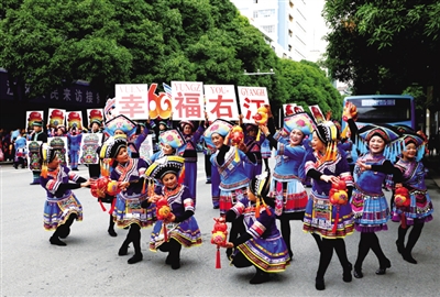 12月9日,百色市举行“千姿百色·多彩壮乡”民族文化巡游展示活动,来自该市12个县(市、区)的各族群众载歌载舞,喜迎自治区成立60周年。(通讯员 陆 杰)