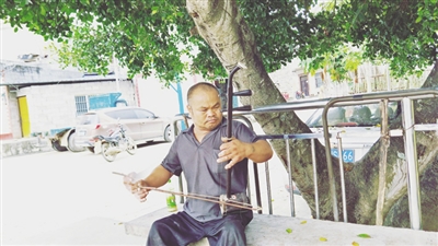 今年8月21日,笔者来到洞坚村时,王学又正在一棵古榕树下忘情地拉着二胡。那动听的二胡声悠扬而缠绵,他已经把所有的注意力都集中在二胡上了,仿佛不是在拉二胡,而是在倾诉。当一曲拉完,他才发现很多人站在他的身旁。王学又放下二胡,微笑着招呼我们坐下。我们原以为王学又只会养猪、开代销店,没想到他还会拉二胡。交谈中,王学又说:“在我30岁那年,村里成立了一支农民文艺队,我家靠近学校,每晚村里爱好唱壮戏的人排练节目我都去看。他们有许多乐器,二胡、三弦琴、锣鼓、笛子、唢呐等,我偷偷跟他们学。”王学又将往事娓娓道来。他告诉我们,在文艺队的精心指导下,几个月后,他终于学会了拉二胡、弹三弦琴、吹唢呐等。之后,王学又也加入了洞坚农民文艺队。2010年春节,王学又跟随文艺队到田林县定安镇演出,当人们看见王学又用手“走”进舞台时哄然大笑起来。但进入演出后,王学又拉的二胡声时而低沉,时而高昂,时而悲调,时而欢跃,一曲结束后,台下爆发出雷鸣般的掌声。王学又激动得流泪了,他为他艰辛的努力和付出取得的成绩而泪洒舞台。后来,每次演出,王学又都积极参加,那劳镇的每个村寨都留下他的足迹。文艺,让王学又的生命变得更加精彩。