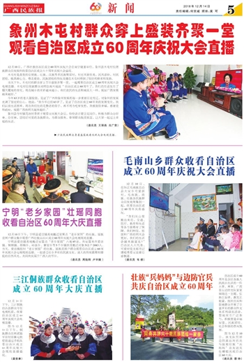 象州木屯村群众穿上盛装齐聚一堂观看自治区成立60周年庆祝大会直播