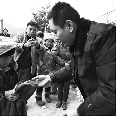 图为西林县民宗局工作人员把冬衣递到贫困群众手中。