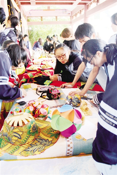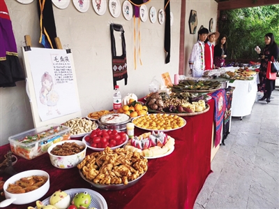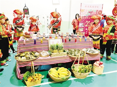 当天的活动中,最有特色的是各班以民族命名的班级展示区,展出了丰富多彩的民风民俗物品,不仅有壮族、苗族、仫佬族、京族、回族等少数民族的特色美食,家长们还带来了手工铜鼓、水族服饰、毛南族面具等独具民族特色的手工艺品。展示区充分体现了学校作为自治区民族团结进步模范集体、自治区民族文化示范学校“民族精神熏陶人,民族文化塑造人,民族艺术培育人”的办学特色。