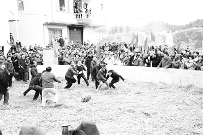 图为群众蒙着眼睛抓猪。(卢逍逍)