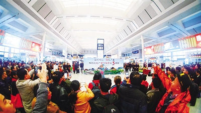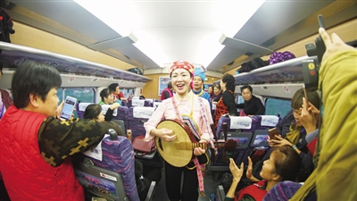 “生态茶乡新气象,白毫茶叶喷喷香;客来先敬名茶水,延年益寿请品尝……”2018年12月28日,高亢、嘹亮、热情的凌云唢呐、山歌声在南宁东站候车大厅内响起,为广西高铁开通五周年庆生。唢呐声响起时,围观的旅客把舞台包围得水泄不通,驻足观看,唢呐声也吹响了“高铁畅游·心仪广西——广西高铁开通5周年”旅游主题动车D9665次启迪声。
