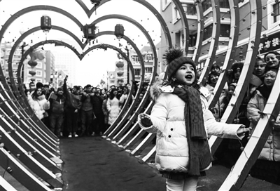 1月1日,在新疆国际大巴扎步行街,一名小演员在活动现场演唱。