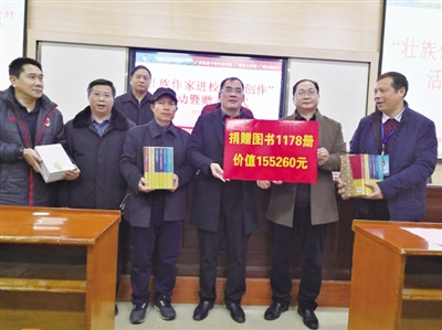 活动中,石朝雄介绍了广西民族出版社《民族团结进步丛书》的出版情况,随后组织者为学校捐赠了1778册书籍和杂志。