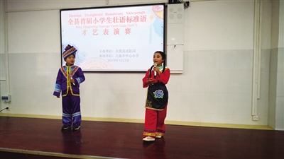为推进“壮汉双语”教学,营造良好的校园学习氛围,培养学生说、用标准壮语的兴趣,1月3日,由大化瑶族自治县少数民族语言文字工作局主办、六也乡中心小学承办的“大化县首届小学生壮语标准语才艺表演赛”在六也小学举行,37位参赛选手进行了精彩表演,全校1000多名师生观看了比赛。