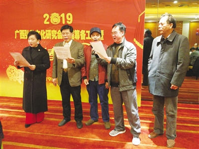 1月13日,广西弘勤文化研究会在南宁国际会展中心召开喜迎新春座谈会,60余名各民族专家、学者欢聚一堂,探讨民族团结、民俗民风、民族文化等方面的问题。其中部分专家学者现场引吭高歌,倾诉对伟大祖国的热爱之情,表达对广西壮族自治区60年来取得巨大成就的赞美,一首首山歌在国际会展中心里回荡着,气氛异常活跃。