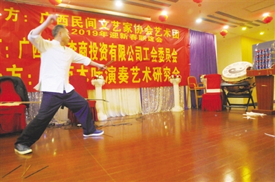 1月13日,适逢传统腊八节,广西民间文艺家协会艺术团和广西木叶演奏艺术研究会在南宁联合举办了2019年迎新春联谊会,来自各行各业的民间艺术家100多人欢聚一堂喜迎新春。民间达人们各显神通:武林高手在10米开外用竹签插穿铁盆、刺破皮球;吹木叶达人口衔木叶吹出美妙乐曲;剪纸达人半分钟剪出一个吉祥字……精彩纷呈的节目,让现场观众大呼过瘾。