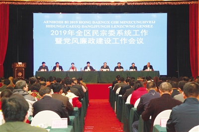本报讯(记者 梁晴)1月23日,广西民宗委系统工作暨党风廉政建设工作会议在南宁召开。会议传达学习贯彻全国统战部长会议、全国民委主任会议精神,总结回顾2018年全区民族宗教工作和全区民宗委系统党风廉政建设工作,研究部署2019年工作,通报表彰先进集体和先进个人。自治区民宗委党组书记、主任,自治区党委统战部副部长何朝建作工作报告。自治区民宗委党组副书记、副主任李振林主持会议。自治区纪委监委驻自治区民宗委纪检监察组组长、民宗委党组成员班美月作党风廉政建设和反腐败工作讲话。