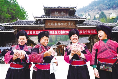 通过发展旅游,当地村民如今成了“扛着犁耙种田地,唱着山歌搞旅游”的“两栖农民”。近年来,龙胜充分发挥地方特色优势,传承民族传统文化,完善旅游基础设施和服务配套,推出“旅游入股分红”的模式,全力推进旅游业发展,让越来越多村民享受到了生态扶贫旅游发展带来的红利。2018年,龙胜全县共接待游客860.18万人次,同比增长10.7%。