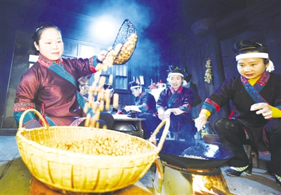 1月28日是农历小年,三江侗族自治县侗族妇女纷纷赶制油果喜迎新春,村村寨寨洋溢着浓浓年味。年前炸油果,新年更红火。侗族同胞一日三餐离不开打油茶,在春节前炸油果打油茶是侗族的一种传统习俗。油果须用优质糯米打粉、揉粉、切条、切丁,并用野生茶油炸制而成,是侗族打油茶不可或缺的佐料之一。