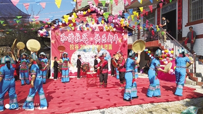 2月8日是正月初四,拉谷屯以孝道为主题的“和谐拉谷·快乐新年”文艺表演主会场周围彩旗飘扬,整个村庄洋溢着节日盛典的气氛。上午9点,60余人组成的“外嫁姐妹”队伍高举着“爸!妈!我们回来和您一起过年了!”的大标语,肩挑五色糯饭等礼物,列队通过村门,精神抖擞地走进主会场。村民们夹道欢迎,大伙互相挥手示意,全场群情激荡。文艺表演在壮族铜鼓舞中拉开序幕,拉谷人以孝道为主题进行歌舞表演,用最有魅力的方式传递中华传统孝道美德。
