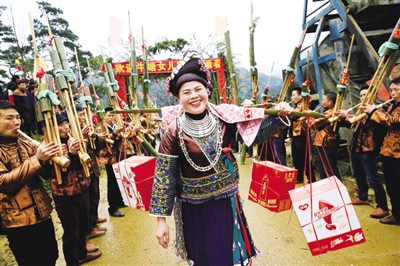 2月9日,融水苗族自治县红水乡良双村牛塘苗寨举行外嫁女集体回娘家活动,300多名外嫁女挑着年货带着家人从四面八方回到娘家,通过芦笙踩堂、唱苗歌和百家宴等传统民俗活动,与娘家人共叙亲情,同贺新春。