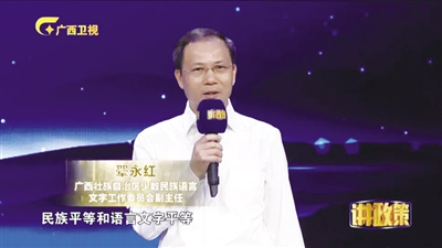近期,广西卫视播出政策解读电视公开课《讲政策》节目,自治区民族宗教事务委员会副主任、原自治区少数民族语言文字工作委员会副主任翚永红担任主讲人,在节目中为观众答疑解惑。本报将该期《讲政策》节目内容整理并予刊发,以飨读者。