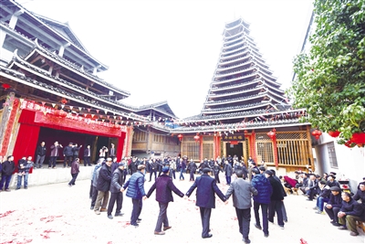 2月26日,三江侗族自治县林溪镇平岩村平坦屯举办鼓楼落成庆典,程阳八寨村民到场祝贺,以打油茶、开门仪式、多耶、百家宴及文艺表演等节目欢庆新楼落成。鼓楼是侗族村寨的标志性建筑,从形式上分为歇山式(俗称屋顶形,因侗族房屋多为歇山顶形而出名)和攒尖顶式(俗称伞顶或尖顶)。鼓楼全用杉木凿榫衔接,不用钉铆,结构精巧,造型美观。