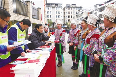 2月21日,融水苗族自治县党委组织开展红色文化进苗寨主题党日活动,10多名党员志愿者通过赠送红色书籍、解读党章党规、佩戴党员徽章、宣传十九大精神等形式,让红色文化深入苗寨,助推脱贫攻坚和乡村振兴。