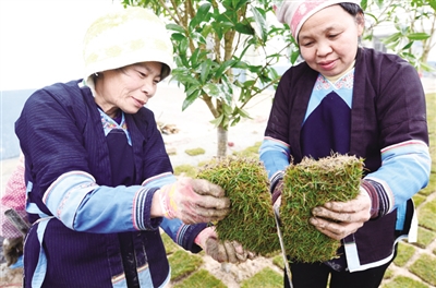 2月26日,在三江侗族自治县富禄苗族乡高岩村,该村的贫困群众正在为易地扶贫安置点的公共场所铺设草皮,通过绿化美化家园,营造良好、舒适的人居环境,助力脱贫攻坚工作。