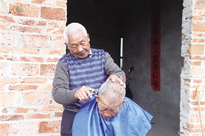 对于那些年长的、行动不便的老人,谢朝登带上理发工具,亲自上门义务为他们理发,几十年如一日。周书德今年91岁,右眼失明,腿脚不方便,他理发的活就被谢朝登包下来了。每两个月理一次,不用提醒,日子一到,谢朝登便主动上门服务,理好发还帮他打扫卫生。在村里,享受谢朝登提供这套服务的老人还有七八个。
