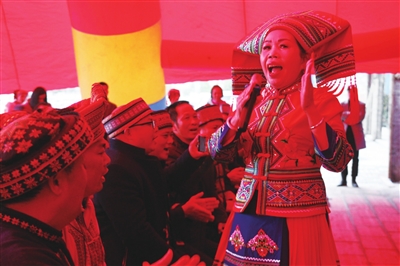 图为3月9日,在恭城瑶族自治县平安镇高铁片区恭城高铁经济产业园瑶族文化村,“武宣婆”郭秀莲现场传授山歌对唱技巧。