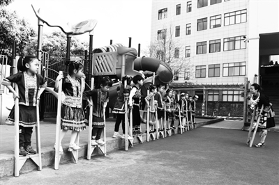3月29日,三江侗族自治县幼儿园的老师在教学生走高翘。近年来,三江侗族自治县结合当地特色的民族文化,加强校园文化建设,构建文明、健康、和谐校园,弘扬民族传统文化,促进学生全面发展。