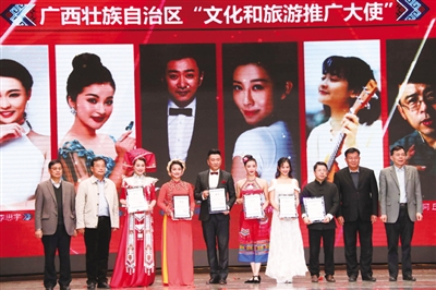 会上,举行了广西壮族自治区“文化和旅游推广大使”授牌仪式。国家一级编剧、中央电视台节目主持人阿丘,《中国好声音》学员、广西艺术学院学生陈永馨,广西歌舞剧院优秀青年舞蹈家梁岱青、广西电视台主持人高枫、越南女歌手杜氏清花、中央电视台大型歌唱大赛《寻找刘三姐》第二季全国总冠军李思宇等6人成为广西“文化和旅游推广大使”。
