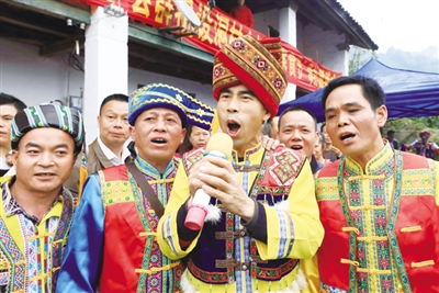 3月31日,在融安县大将镇设洞村金杯屯举办的“寒食节”山歌演唱会上,身着民族盛装的壮族群众唱起壮家山歌,用山歌表达当地精准扶贫以来山乡发生巨大变化,歌颂党的恩情,引导各族群众树立“知党恩、听党话、跟党走”的意识,以此迎接“壮族三月三”的到来