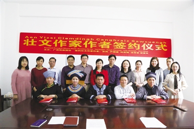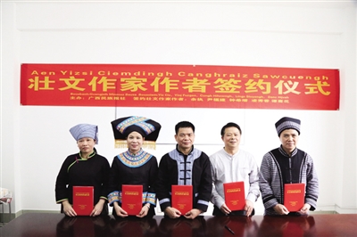 2018年3月,本报举行了首期“壮文作家作者签约仪式”,与余执、尹福建、钟希增、陆如刚、凌秀香5位壮文作家作者签订了为期一年的合约,约请签约作家作者用母语创作,并确定了创作任务量。广西民族报在壮文版开辟“壮文签约作家作者专版”,刊登签约作家作者创作的精品力作。