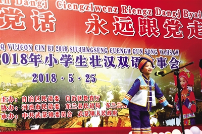 壮汉双语教学和民族文化教育相结合。一是双语教学持续开展。武篆镇江平小学和镇中心小学坚持开设壮语文课程,双语教育质量不断提升。二是举办“小学生壮汉双语故事会”活动。故事会活动全程采用壮汉双语主持,17名小选手分别用标准壮语、本地壮话方言、普通话演讲,活动深受学生、老师及家长的欢迎。
