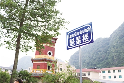 翻译制作壮汉两种文字牌匾。一是单位壮汉文字牌匾:镇政府各单位挂牌、干部去向牌、政务大厅标识牌、办公室名称和司法所、派出所便民服务台均使用壮汉两种文字;二是公路交通指示牌、武篆镇沿线13个村屯地名牌、旅游景点魁星楼和列宁岩景区简介都同时使用壮汉文;三是着力打造“壮汉双语一条街”,制作大型户外双语标识牌22块,制作商铺名称双语标识牌15块;四是以自治区成立60周年为契机,对全县各机关单位220块单位牌匾、93枚公章使用壮汉两种文字情况,以及各单位悬挂壮汉宣传标语情况进行督查。另外,该县还增加了城区范围内拔群烈士陵园壮文标识牌、进城高速路口交通旅游壮文导览牌、东兰县人民政府门户网站壮文主标题等,通过各种途径营造浓厚的双语和谐氛围。
