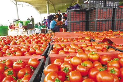 图为4月22日,在南宁市下灵村西红柿交易市场,农民将刚采摘的西红柿分拣装箱,准备销往外地市场。