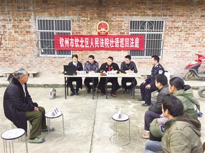 壮语巡回法庭挑选土地、继承、赡养、邻里纠纷等有典型教育意义的案件,运用便携式科技法庭设备到农村甚至农户家中巡回开庭。利用“壮族三月三”等壮族特色节日和辖区各镇的圩日开展法制宣传,向群众宣传壮语巡回办案的便民性及法律知识。此外还通过展板、公告栏、报刊、网络、微信公众号等媒体广泛宣传壮语巡回审判的经验做法,让群众了解壮语审判,进而利用壮语诉讼案件绿色通道更快捷更全面地维护自己的合法权益。去年8月9日,钦州市电视台《法治钦州》栏目制作的《壮语法庭传乡音》节目报道了壮语巡回法庭审理的一起法定继承纠纷案件,在当地引起强烈反响,取得良好的社会效果。