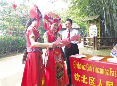 钦北区法院为涉壮语诉讼案件开通绿色通道,在立案窗口显眼位置设立壮语诉讼提示,推行“壮语诉讼申请书”,对壮语案件进行分流,由精通壮汉双语的壮语审判团队专门审理,对涉壮语诉讼案件优先立案、优先调解、优先审判,对壮语诉讼困难当事人优先提供法律援助。该院还成立壮语法官工作室,把民族语言运用延伸到村委会、自然村,依托壮语法官工作室开展巡回审判。
