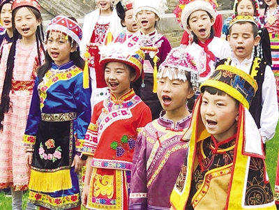 图为9岁的仫佬族小姑娘吴桑瑜(前右3)和其他民族少年儿童一起唱歌。