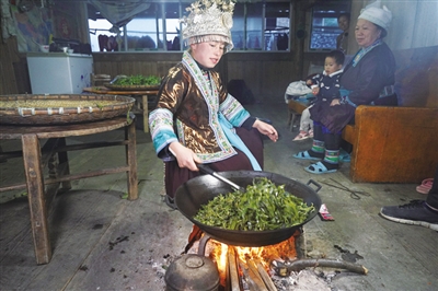 2019年5月6日,融水苗族自治县杆洞乡中讲村,苗族妇女在炒茶。