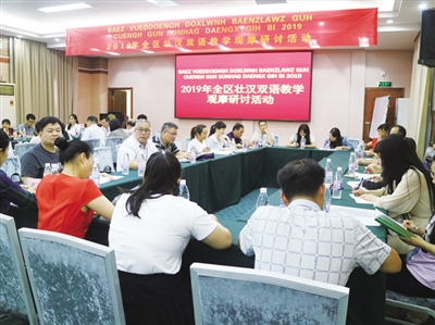 本次活动的内容有观摩覃塘区壮汉双语壮语文课,参观覃塘区壮汉双语学校,评课及教学交流研讨,以及教育专家对观摩课及校园民族文化建设进行点评,来自覃塘、上林、马山、兴宾、武宣、象州、忻城、武鸣、环江等县区的壮汉双语教研员、壮汉双语小学壮语文教师及南宁师范大学教育专家近100人参加了本次观摩研讨活动。