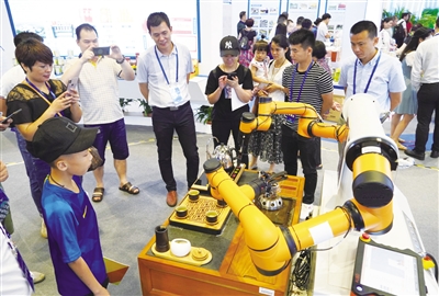 图为5月19日,在广西创新驱动发展成果展上,一所高校师生共同研制的茶艺表演机器人吸引人们的目光。(通讯员 喻湘泉 摄)