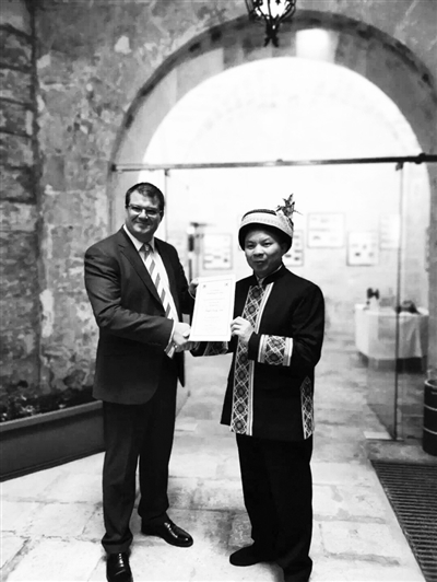 图为上林县县长蓝宗耿(右)在马耳他领取相关证书。