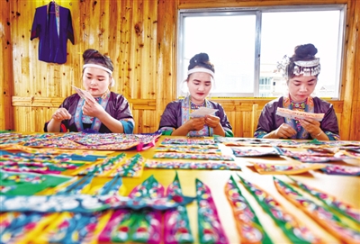 5月17日,几名绣娘在三江侗族自治县独峒镇唐朝村侗娘手工坊内刺绣。近年来,唐朝村立足村情,通过创建“侗娘手工坊”,积极引导留守妇女抱团发展手工刺绣“指尖经济”,由村第一书记牵线搭桥,招揽和承接刺绣订单,多渠道拓宽绣品销路,让侗族妇女居家创业,轻松实现顾家、传艺、脱贫“三不误”。
