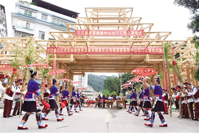 6月22日,三江侗族自治县举办游客集散中心大门上梁仪式,以芦笙踩堂、上梁祭祀、抛撒喜糖等传统仪式,尽展侗家楼桥文化魅力,吸引不少游客前往观赏体验。