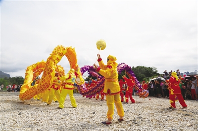 下南乡则是毛南族发祥地,至今仍保存着最原汁原味的毛南族文化和最淳朴的毛南风情。毛南族分龙节是毛南族祈神保佑丰收的传统节日,于每年农历夏至后的第一个辰日(龙日)前后举行,活动一般持续三到五天,是毛南族最古老、最盛大、最重要的节日。图为毛南族群众舞龙庆祝节日。(通讯员 韦 睿)