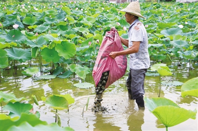 为提高群众在农业旅游观光带种植太空莲的经济效益,鹿寨县首批引进6900公斤种螺,投放到藕田里,让田螺在藕田生长繁殖。据水产部门测算,每亩藕田养殖田螺产量达到300公斤以上,每公斤收购价8~10元,藕田亩增收入2400元以上。图为6月22日,鹿寨县中渡镇大兆村群众在藕田放养田螺。